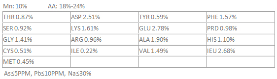 - As a special additive, Mn Amino Acid Chelate has a great effect, and can increase Mn's utilization ratio more than 25%.
