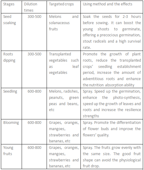 - Increase the resilience strengths, like drought resistance, cold resistance, waterlogging resistance, disease resistance and frost damage prevention, etc; increase the utilization rate and the efficiency of chemical fertilizers and pesticides and mitigate the chemical hazard on crops.